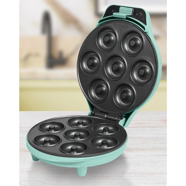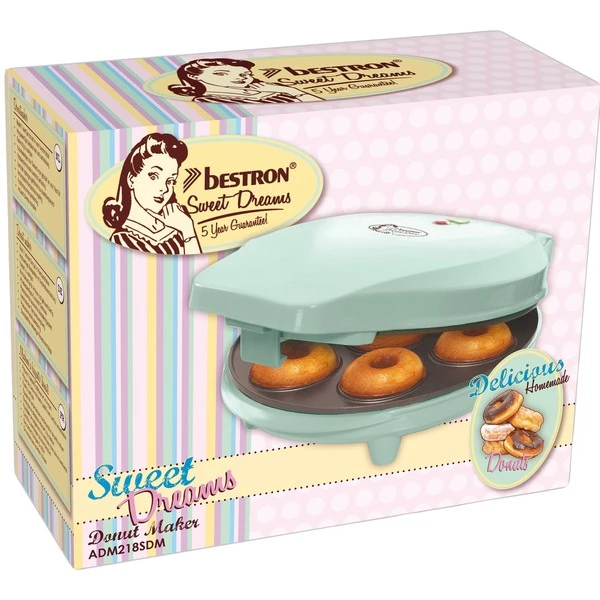 Der Donutmaker ADM218SDM von Bestron backt 7 leckere Donuts im Handumdrehen. Die Kontrollleuchte informiert darüber ob das Gerät angeschlossen und ob es betriebsbereit ist. Das Gehäuse in frischem Mint besteht aus hitzbeständigem Kunststoff. Der Donutmaker ist innerhalb weniger Minuten einsatzbereit und die Bedienung ist dank der automatischen Temperaturregelung und der Backampel ein Kinderspiel. Die Antihaftbeschichtung sorgt für leichtes Entnehmen der Donuts sowie für eine einfache Reinigung.