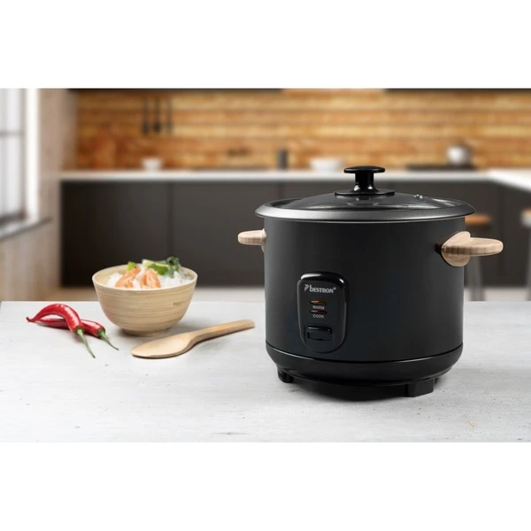 Der Reiskocher ARC180BW von Bestron kocht schnell und vollautomatisch alle Sorten Reis sowie Natur, Basmati, Risotto, Wild, Sushi Reis etc. Mit 1,8 Liter Volumen können bis zu 1350 g Reis zubereitet werden, das reicht für acht bis zehn Personen. Die Warmhaltefunktion hält den Reis nach dem Kochen für längere Zeit auf der perfekten Temperatur. Über den Glasdeckel mit Dampfaustrittsöffnung hat man den Reis immer im Blick. Der Innentopf mit Messskala ist zur einfachen Reinigung herausnehmbar und mit einer spülmaschinenfesten Antihaftbeschichtung ausgestattet. Die Bedienung erfolgt ganz einfach über einen Ein-/Aus-Schalter. Es gibt jeweils eine Kontrollleuchte zum Kochen und zum Warmhalten.