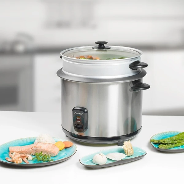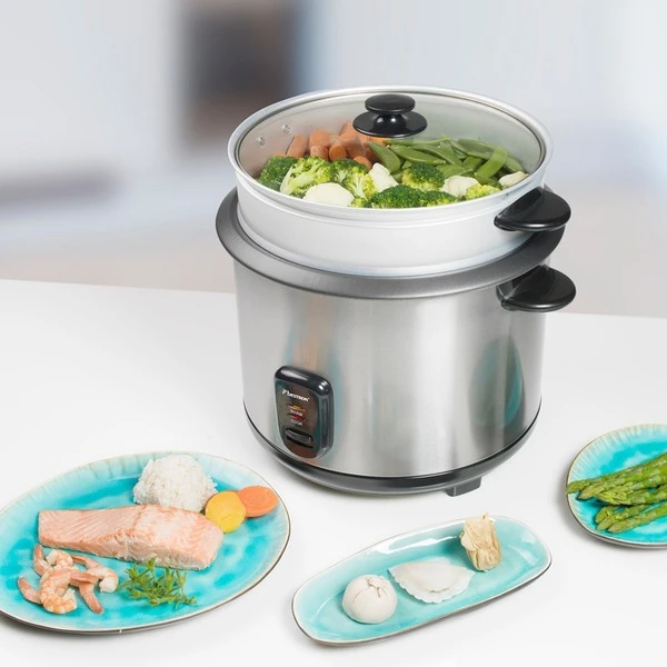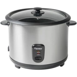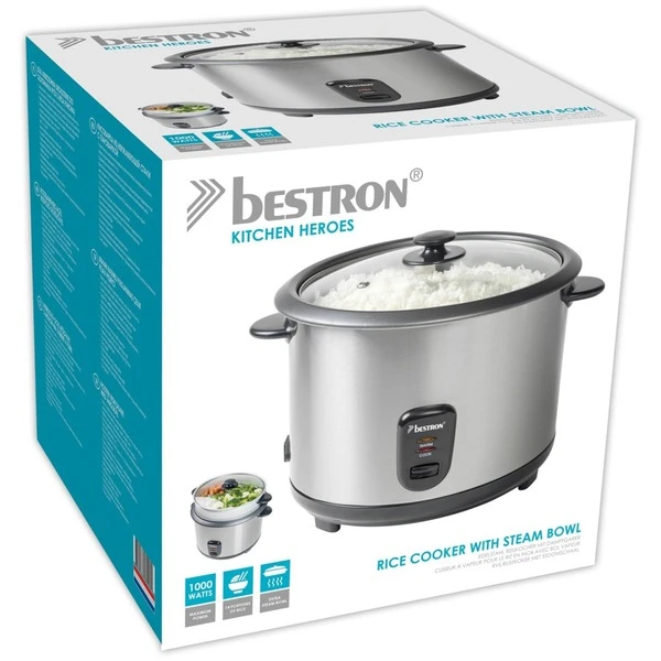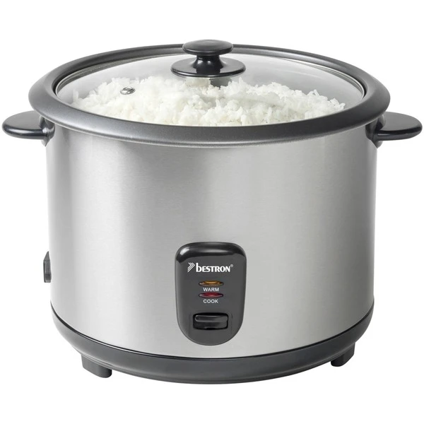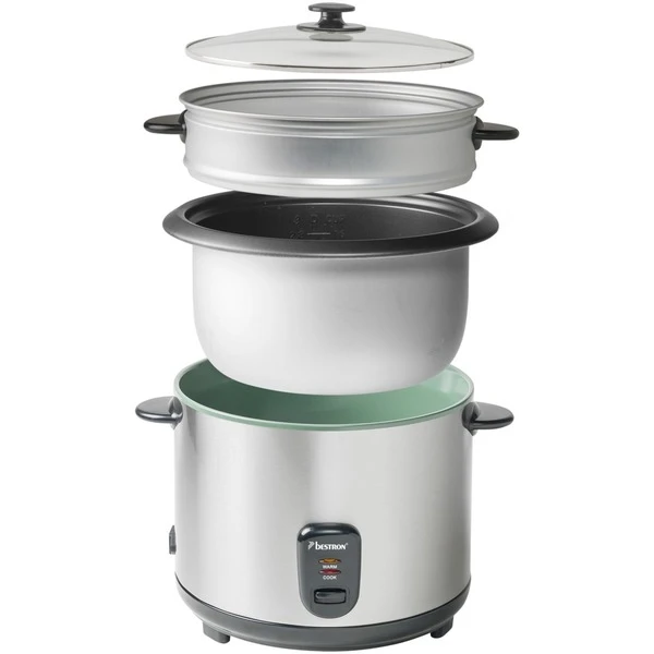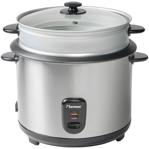 Der Bestron ARC280 ist Reiskocher und Dampfgarer in Einem. Er kocht schnell und vollautomatisch alle Sorten Reis sowie Natur, Basmati, Risotto, Wild, Sushi Reis etc. Mit dem extra Dampfgaraufsatz (Ø 26,5 cm) lassen sich Gemüse, Fisch, Dumplings, etc schonend garen. Der ARC280 hat eine maximale Kapazität von 2100 g Reis, das entspricht ca. 14 Tassen und reicht für 13 – 15 Personen. Die Warmhaltefunktion hält den Reis für längere Zeit auf der perfekten Temperatur. Für Sicherheit sorgen zwei Kontrollleuchten zum Kochen und zum Warmhalten. Die Bedienung ist sehr einfach und die automatische Abschaltung macht die Nutzung noch bequemer. Durch den Glasdeckel mit Dampfaustrittsöffung hat man den Garvorgang immer im Blick. Die Innenwanne ist antihaftbeschichtet und verfügt über eine Wasserstandanzeige. Zur einfacheren Reinigung ist die Innenwanne spülmaschinengeeignet. Art.-Nr.: 1535869