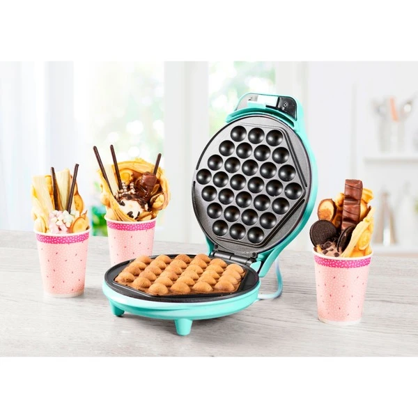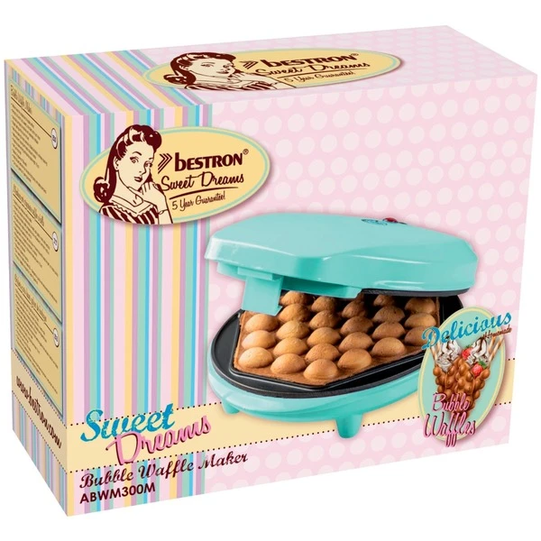 Mit dem Bubble-Waffeleisen ABWM300M von Bestron lässt sich eine herrliche Bubble-Waffel zaubern, die sich ideal zum Befüllen mit Obst, Eis, Schokolade und vielem mehr eignet. Das Waffeleisen ist innerhalb weniger Minuten einsatzbereit und die Bedienung ist dank der automatischen Temperaturregelung und der Bereitschaftsanzeige ein Kinderspiel. Die Antihaftbeschichtung sorgt für leichtes Entnehmen der leckeren Bubble-Waffel und für eine einfache Reinigung. Das Gehäuse in zartem Mintgrün ist hitzebeständig und die Griffe sind wärmeisoliert. Für noch mehr Sicherheit sorgen die Antirutschfüße.Art.-Nr.: 1915013