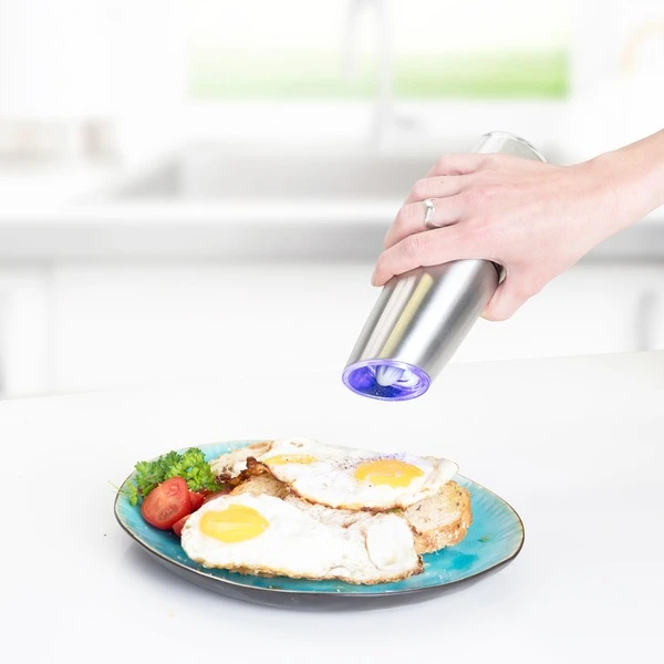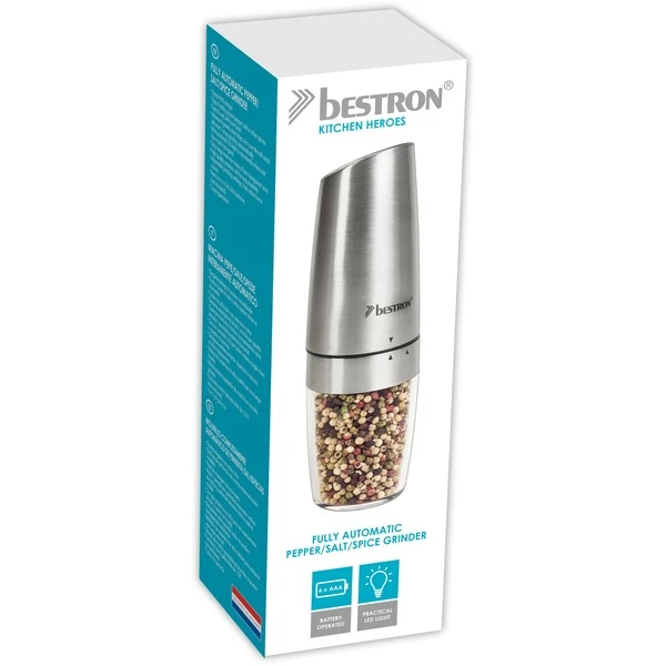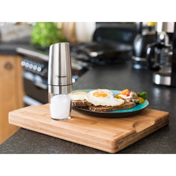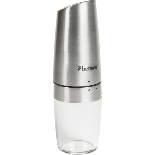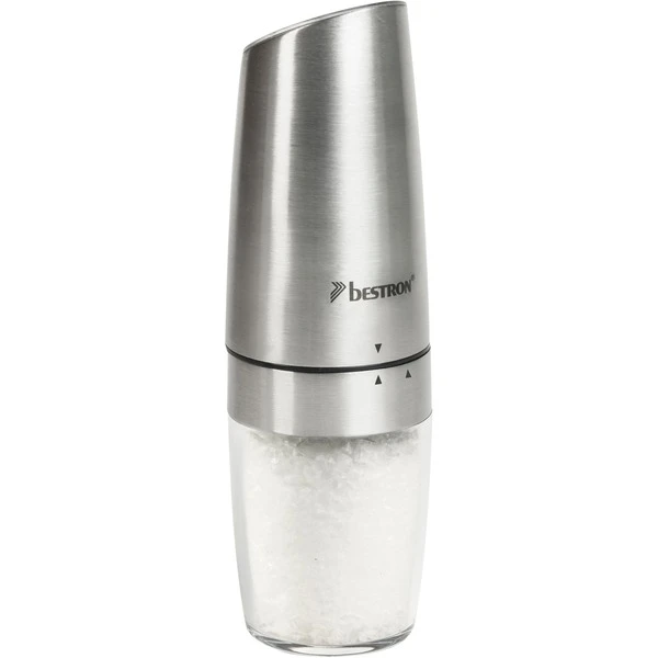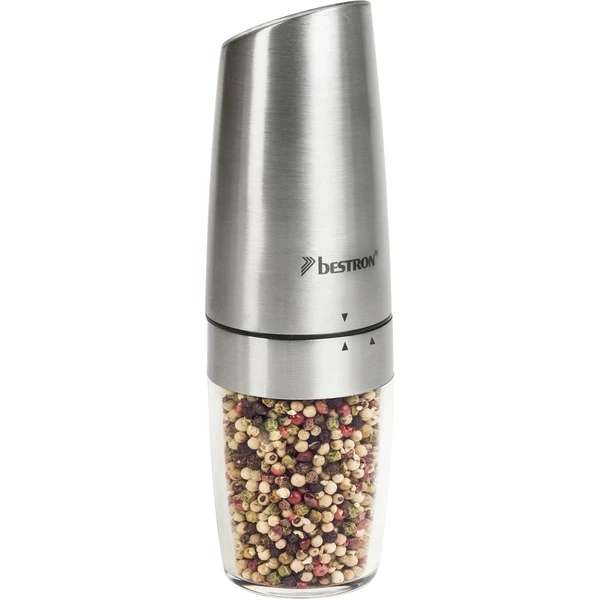 Mit der elektrische Salz- und Pfeffermühle APS300CH in sitlvollem Edelstahl-Design von Bestron genießt man frisch gemahlenen Pfeffer, Salz oder andere Gewürze. Die innovative Start / Stopp-Steuerung erfolgt durch Schwerkraft und ermöglicht eine entspannte Bedienung mit nur einer Hand. Wird die Mühle gekippt beginnt oder stoppt der Mahlvorgang automatisch. Der Mahlgrad ist einstellbar von sehr fein bis grob. Der große, transparente Füllbehälter besteht aus robustem Acryl. Das hochwertige Keramik-Mahlwerk sorgt für eine lange Lebensdauer. Für weiteren Komfort sorgt die integrierte LED, so sieht man immer genau wie viel gemahlen wurde.