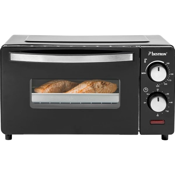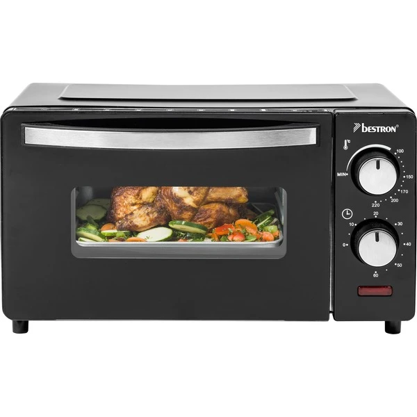 Der Grill-Backofen AOV9 von Bestron bietet einen Garraum von 9 Litern und ist damit ideal zum Zubereiten von Toasts, kleinen Ofengerichten oder zum Aufbacken von Brötchen gegeeignet. Der AOV9 verfügt über Ober- und Unterhitze sowie ein Backblech, einen Grillrost und eine Krümelschublade. Die Temperatur lässt sich bis 220°C einstellen. Er ist mit einem 60-Minuten-Timer mit Signalton nach Beenden der Backzeit und einer Abschaltautomatik ausgestattet.