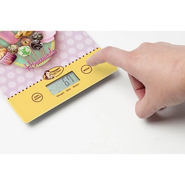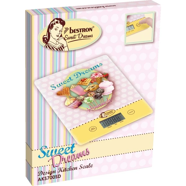 Die Bestron Küchenwaage AKS700R „Sweet Dreams“ ist eine batteriebetriebene Waage mit LCD-Anzeige. Die LCD-Anzeige ist gut lesbar und verfügt über eine Batterie- und Überlastungsanzeige. Diese Küchenwaage zeigt das Gewicht von 1 g bis zu ihrer maximalen Tragkraft von 5 kg an. Sie kann für Messung von Milch und Wasser in ml genutzt werden und verfügt auch über eine praktische Tara/ Zuwiegefunktion.