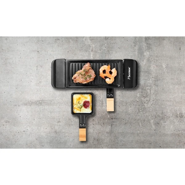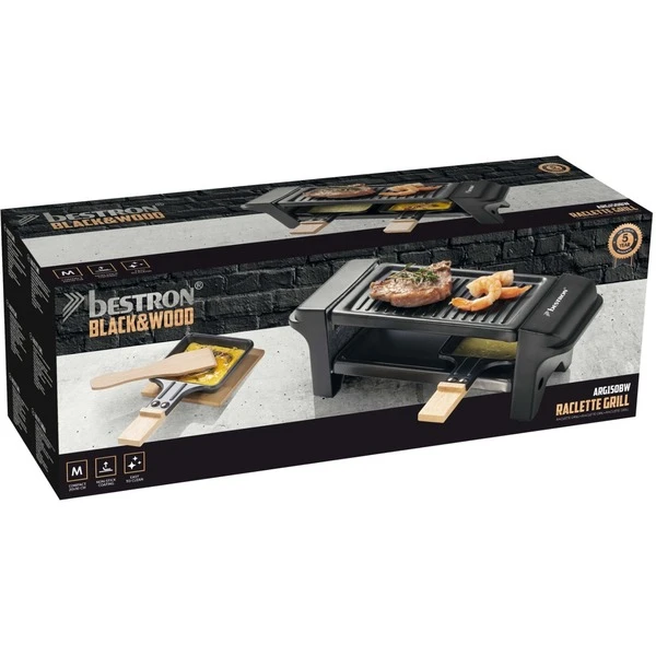 Das Bestron Mini Raclette der Black & Wood Serie im hochwertigen Holzdesign bietet Genuss im kompakten Format und eignet sich für zwei Personen. Die Bedienung ist über den Ein-/Ausschalter sehr einfach und durch die Leistung von 350 Watt ist das Gerät schnell einsatzbereit. Damit auch bei längerer Hitze nichts hängen bleibt, sind die Pfännchen mit einer Antihaftbeschichtung versehen. Auf der großen 10 x 20 cm großen, spülmaschinengeeigneten Grillplatte können Fleisch, Fisch und Gemüse gegrillt werden. Art.-Nr.: 1742922