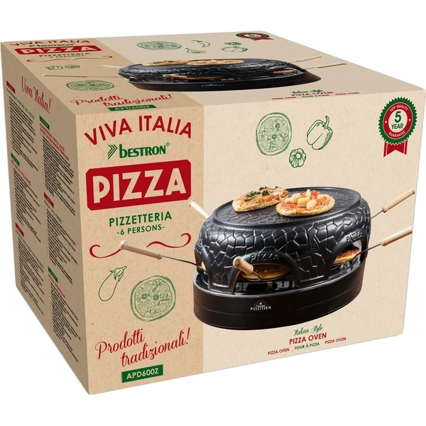 Der elektrische Pizzaofen Pizzetteria APD600Z bietet gemeinsamen Partyspaß am Tisch. Bis zu max. 6 Personen können zusammen Mini-Pizzen, kleine Flammkuchen oder Quiches bis Ø 10 cm genießen. Die Keramikkuppel sorgt für eine gleichbleibende Wärmeverteilung und ist auch geeignet zum Auflegen und Vorwärmen des Pizzateigs. Die Keramikkuppel ist abnehmbar und erleichtert die Reinigung. Im Lieferumfang sind 6 x wärmeisolierte Backspatel und 1 x Teigausstecher.