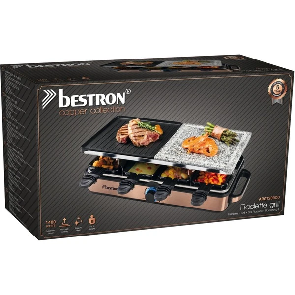 Der Bestron Raclette-Grill der Copper Collection im stilvollen Kupfer-Design bietet Partyspaß für bis zu 8 Personen. Für ein optimales Grillergebnis verfügt der ARG1200CO über eine antihaftbeschichtete Wendegrillplatte (21x21cm) aus Gusseisen mit glatter und gerillter Oberfläche und eine kratz- und schnittfeste Grillsteinplatte (21x21cm) mit Saftrinne, für ein optimales Grillergebnis ohne Zugabe von Öl. Die Bedienung ist dank stufenloser Temperaturregelung mit Kontrollleuchte, sowie dem integrierten Leuchtring sehr einfach und durch die Leistung von 1400 Watt ist das Gerät schnell einsatzbereit. Damit auch bei längerer Hitze nichts hängen bleibt, sind auch die Pfännchen mit einer Antihaftbeschichtung versehen.