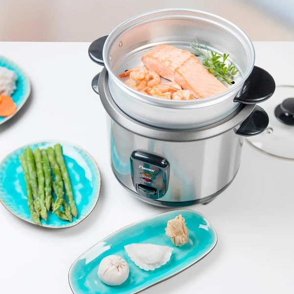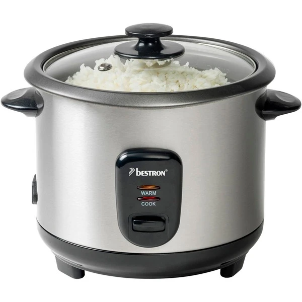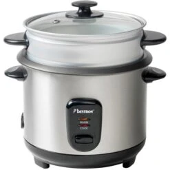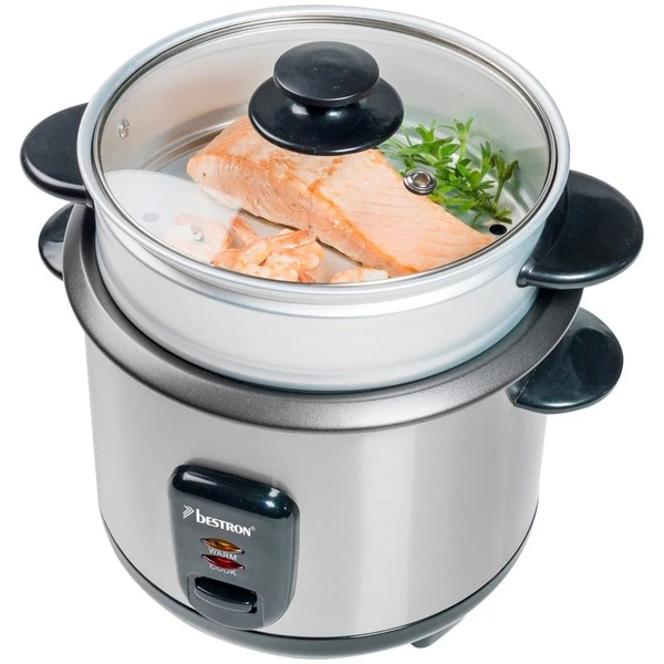 Der Bestron ARC100 ist Reiskocher und Dampfgarer in Einem. Er kocht schnell und vollautomatisch alle Sorten Reis sowie Natur, Basmati, Risotto, Wild, Sushi Reis etc. Mit dem extra Dampfgaraufsatz (Ø 19cm) lassen sich Gemüse, Fisch, Dumplings, etc schonend garen. Der ARC100 hat eine maximale Kapazität von 750g Reis, das entspricht ca. 5 Tassen und reicht für 4 – 6 Personen. Die Warmhaltefunktion hält den Reis für längere Zeit auf der perfekten Temperatur. Für Sicherheit sorgen zwei Kontrollleuchten zum Kochen und zum Warmhalten. Die Bedienung ist sehr einfach und die automatische Abschaltung macht die Nutzung noch bequemer. Durch den Glasdeckel mit Dampfaustrittsöffnung hat man den Garvorgang immer im Blick. Die Innenwanne ist antihaftbeschichtet und verfügt über eine Wasserstandanzeige. Zur einfacheren Reinigung ist die herausnehmbare Innenwanne spülmaschinengeeignet.