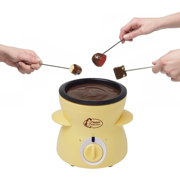 Das Bestron Schokoladenfondue ist ideal zum Schmelzen von Schokolade, für köstliche heiße Schokoladensoße zu Desserts und `Candy Melts´ für die Dekoration von Muffins, Cakepops, Donuts, Kuchen usw. Mit einem Ein/Aus-Schalter mit Kontrollleuchte und 2 Heizstufen zum Aufwärmen / Schmelzen und Warmhalten ist die Bedienung sehr leicht. Die antihaftbeschichtete Schale fasst 300 ml und ist zur einfachen Reinigung herausnehmbar und spülmaschinenfest. Die Antirutschfüße sorgen für einen festen Stand. Art.-Nr.: 1435773
