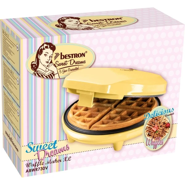 Mit dem Waffeleisen ABWR730V von Bestron lassen sich vier herrliche Brüsseler Waffeln zaubern. Das Gehäuse in frischem Mint ist hoch hitzebeständig und die Griffe sind wärmeisoliert. Für noch mehr Sicherheit sorgen die Antirutschfüße. Das Waffeleisen ist innerhalb weniger Minuten einsatzbereit und die Bedienung ist dank der automatischen Temperaturregelung und der Bereitschaftsanzeige ein Kinderspiel. Die Antihaftbeschichtung sorgt für leichtes Entnehmen der Waffel sowie für eine einfache Reinigung.Art.-Nr.: 1820277