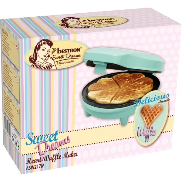 Mit dem Waffeleisen ASW217M von Bestron lassen sich herrliche Herzwaffeln zaubern. Mit der automatischen Temperaturregelung und der praktischen Kontrollleuchte für “gebrauchsfertig” und “An/Aus” sind viele Waffel-Variationen möglich. Das Gehäuse in frischem Mint ist hitzebeständig und für einen sicheren Stand sorgen die Antirutschfüße. Die Reinigung ist dank der Antihaftbeschichtung ein Kinderspiel.Art.-Nr.: 1742124