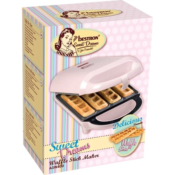 Mit dem Waffelstick-Maker ASW400 von Bestron lassen sich vier herrliche Waffelsticks zaubern. Dank der 460 Watt und der „gebrauchsfertig“ Kontrollleuchte sind die Waffelsticks im Handumdrehen fertig. Das Gehäuse in zartem Rosa und die Griffe sind hoch hitzebeständig und für noch mehr Sicherheit sorgen die Antirutschfüße sowie der Überhitzungsschutz. Die Reinigung ist dank der der hochwertigen Antihaft-Backplatten ein Kinderspiel.Art.-Nr.: 1697682
