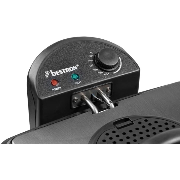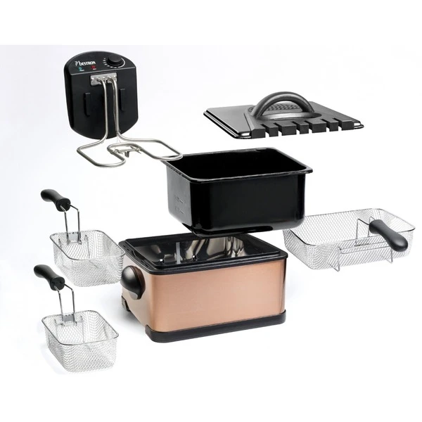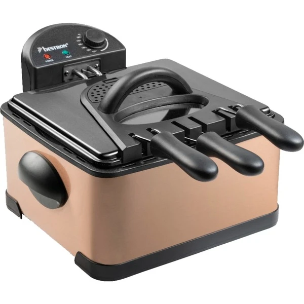 Die XL Fritteuse DF402CO von Bestron mit Kaltzonentechnologie im hochwertigen Kupfer-Design, erhitzt mit 2000 Watt im Handumdrehen das Frittierfett. Der herausnehmbare, emaillierter Fettbehälter fasst 4,5 l. Es gibt einen großen Frittierkorb und zwei kleine. Mit dem Großen können in einem Durchgang bis zu 1,5 kg Pommes oder bis zu 20 Frikadellen frittiert werden. Die kleinen Körbe fassen jeweils 750 g. Die Betriebstemperatur lässt sich stufenlos bis 190 Grad regeln. Im Deckel der XL Fritteuse befindet sich ein auswechselbarer Geruchsfilter sowie ein Sichtfenster. Anti-Rutsch-Füße und wärmeisolierte Handgriffe sorgen für einen sicheren Gebrauch und danach lässt sich das Gerät vollständig zerlegen und in der Spülmaschine reinigen – außer das Heizelement.