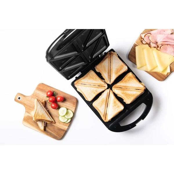 Der XXL Sandwichtoaster ASM13XXLZ macht das Zubereiten von leckeren Sandwiches zum Kinderspiel. Mit einer Leistung von 1300 Watt und automatischer Temperaturregelung lassen sich einfach 4 Toastscheiben oder 8 Sandwichtoasts in Dreiecksform zubereiten. Die Bereitschaftsanzeige signalisiert das Erreichen der passenden Backtemperatur. Die Antihaftbeschichtung sorgt für leichtes Entnehmen der Sandwiches sowie für eine einfache Reinigung.. Für einen sicheren Gebrauch sorgen das wärmeisolierende Gehäuse, der Griff mit Verschlussclip und die Antirutschfüße. Art.-Nr.: 1820340