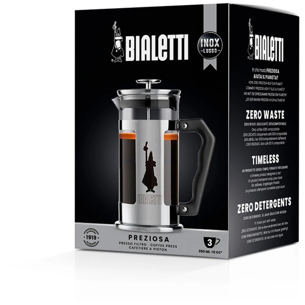 Der elegante Stil sowie das moderne Design des Bialetti Preziosa Kaffeebereiters heben sich von der Masse ab und verleihen dem gedeckten Frühstückstisch das gewisse Extra. Mit diesem Kaffeebereiter (auch French Press genannt) genießt man Kaffee so stark und aromatisch wie man es möchte. Das heiße Wasser zieht das Beste für den Kaffee aus dem Kaffeepulver und der Papiergeschmack eines Filters bleibt erspart. Auch werden die feinen Aromaöle des Kaffees nicht im Papierfilter aufgesaugt. Feinschmecker schwören auf diese Zubereitungsart des Kaffees. Deckel und Halterung des Preziosa Kaffeebereiters bestehen aus rostfreiem Edelstahl 18/10 und der Behälter aus hitzebeständigem Borosilikatglas fasst bis zu 0,35 Liter Kaffee.Art.-Nr.: 1525001