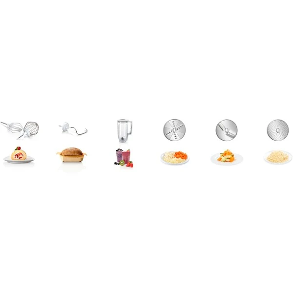 | Zubehör | vorhanden | 1x Knethaken mit Teigabweiser, Schlag- und Rührbesen, 1x Durchlaufschnitzler inkl. 3 Edelstahlscheiben (Schneid-, Raspelwendescheibe, Reibscheibe mittelfein), 1x Mixer-Aufsatz Kunststoff 1,25 l, 1 x Zubehörtasche dunkelgrau, 1x transparenter Deckel mit Einfüllöffnung, 1x interaktive Rezept DVD | |