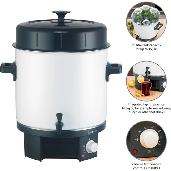 Mit dem Einkoch-/Heißgetränkeautomat EKA 3338 von Clatronic kann man Säfte, Gemüse oder Obst auf einfache Weise konserviert werden. Man kann den EKA 3338 aber auch zum Erwärmen größerer Mengen Heißgetränke einsetzen. Der Einkochautomat hat ein Fassungsvermögen von 25 Litern. Mit dem Thermostat kann eine Temperatur von 30°C bis 100°C eingestellt werden. Der Behälter ist mit einer beständigen Emaillierung versehen, die geschmacksneutral und kratzfest ist.Art.-Nr.: 1493764