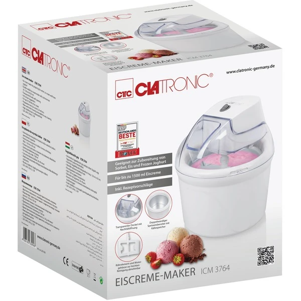 Mit dem Clatronic Eiscreme-Maker ICM 3764 kann man zu Hause kostengünstig und schnell Eiscreme herstellen. Der Eiscreme-Maker ICM 3764 macht cremiges Eis und kühle Dessert-Spezialitäten. Innerhalb von nur 20-40 Minuten erhält man 1,5 Liter schmackhafte Eiscreme, Sorbet oder Frozen Joghurt. Das Gerät punktet mit dem doppelwandigen Speisebereiter mit Kältespeicher und einem sicheren Stand. Nach dem Gebrauch kann man zur einfachen und schnellen Reinigung das Rührelement und das Motorgehäuse leicht abnehmen.Art.-Nr.: 1746306
