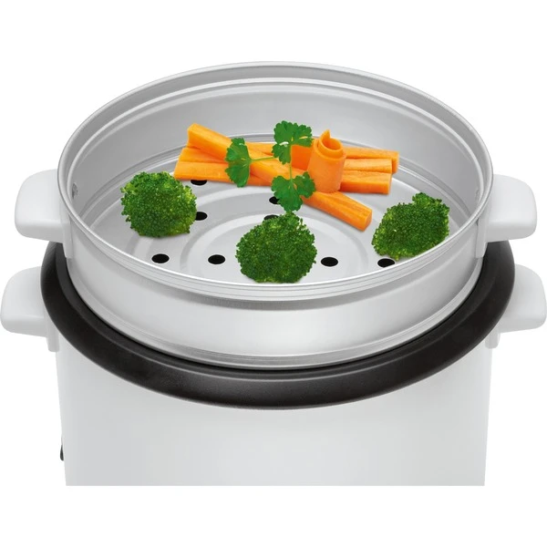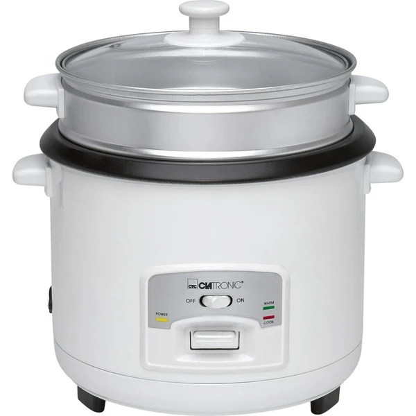 Der Clatronic RK 3566 ist Reiskocher und Dampfgarer in Einem. Er eignet sich für einfaches Zubereiten und Warmhalten aller Reisarten, Hülsenfrüchte, Suppen, oder Getreide. Mit dem Alu-Dampfeinsatz lassen sich Gemüse, Kartoffeln oder Fisch schonend und vitaminerhaltend garen. Cool Touch Griffe und ein Glasdeckel mit Dampfauslassöffnung sorgen für einen sicheren Betrieb. Der RK 3566 fasst 1300 g Rohgewicht, was in etwa 2500 g gekochtem Reis entspricht.Art.-Nr.: 1460040