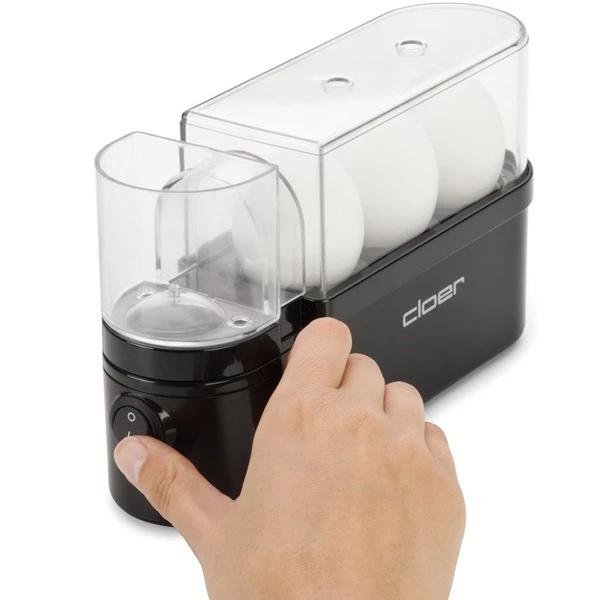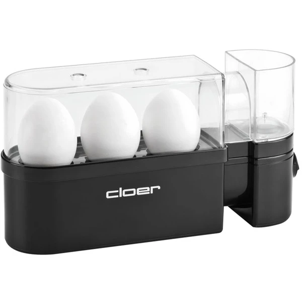 Der Cloer Eierkocher 6020 ist der Eierkocher für kleinere Haushalte, den mit dem Cloer Eierkocher 6020 kocht man maximal drei Eier auf einmal. Das ungewöhnliche Design macht ihn leicht verstaubar. Die transparente Haube, der Eierträger und der Einsatz des Eierkocher 6020 sind spülmaschinengeeignet. Mit dem beiliegenden Meßbecher kaltes Wasser abmessen, Eier in den Einsatz stellen und abdecken. Wenn die Eier fertig sind ertönt ein akustisches Signal. Der praktische Ei-Halter lässt sich zum Abschrecken herausnehmen. Durch das Perforieren der Eierschale mit dem integrierten Ei-Pick an der Unterseite des Messbechers vermeidet man geplatzte Eier.Art.-Nr.: 943684
