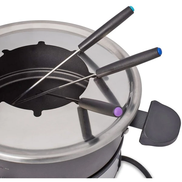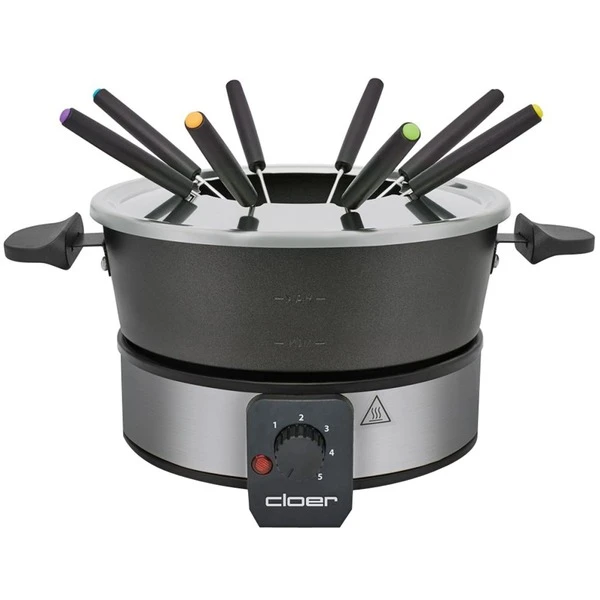 Das Cloer Fondue 6679 für 8 Personen ist geeignet für Fondue-Käse, Brühe oder Fette. Über einen Drehregler kann die Temperatur eingestellt werden und so eignet sich das Fondue zum Aufheizen, Frittieren und Warmhalten von Speisen. Der abnehmbare Aluminium-Topf fasst 1,5 Liter und ist antihaftbeschichtet. Die 8 farbig markierten Fonduespieße besitzen Widerhaken für einen besseren Halt. Der Spritzschutz ist im Lieferumfang enthalten. Die Reinigung der Basis erfolgt mit einem feuchten Tuch, Topf, Spieße und der Spritzschutz sind spülmaschinengeeignet.Art.-Nr.: 1675959