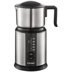 Der Milchaufschäumer 7789 von Cloer überzeugt mit 500 Watt Leistung. In dem abnehmbaren Metallbehälter mit Deckel lassen sich bis zu 250 ml Milch aufschäumen. Die Bedienung ist dank des Ein-/Ausschalters und der 5 unterschiedlichen Modi sehr einfach. Das Aufschäumen der Milch erfolgt mit einer magnetischen Spule und das ganz ohne Führungsstab oder Führungsachse in dem Edelstahlkännchen. Die Spule wird wie von unsichtbarer Hand zentriert und angetrieben. Wird der fertige Milchschaum ausgegossen, fällt die Spule nicht in die Tasse, sondern haftet seitlich an dem Kännchen. Die Reinigung ist aufgrund nicht notwendiger Führungselemente sehr leicht. Milchkännchen, Spule und falls notwendig der Deckel können unter fließendem Wasser oder in der Spülmaschine gereinigt werden.