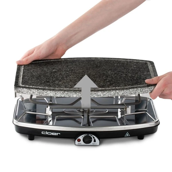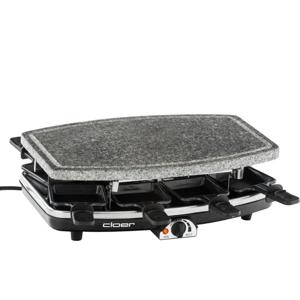 Der Cloer Raclettegrill 6430 mit abnehmbarer Natursteinplatte, 8 antihaftbeschichtete Raclettepfännchen mit wärmeisolierten Griffen besitzt einen Temperaturregler, eine Kontrolllampe und ist leicht zu reinigen. Die rutschfesten Gummifüße sorgen für einen sicheren Stand.Art.-Nr.: 1675958