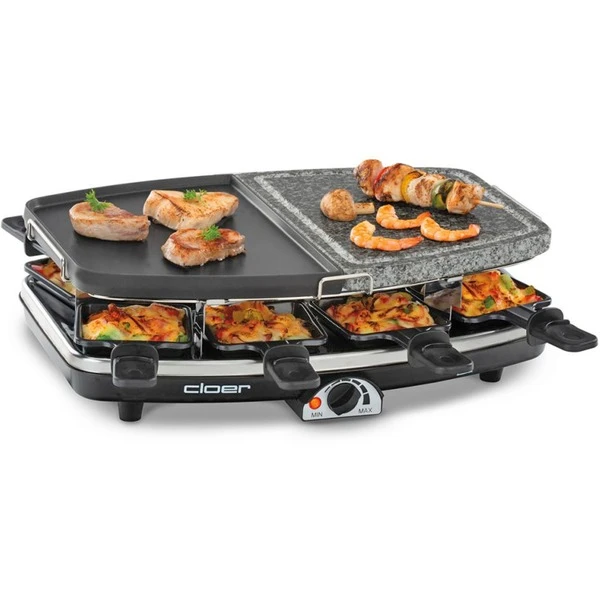 Der Cloer Raclettegrill 6435 kommt mit zwei abnehmbaren Grillplatten: 1x Natursteinplatte und 1x Aluminium-Druckgussplatte (antihaftbeschichtet) und 8 antihaftbeschichteten Raclettepfännchen mit wärmeisolierten Griffen. Der 6435 besitzt einen Temperaturregler, eine Kontrolllampe und ist leicht zu reinigen. Die rutschfesten Gummifüße sorgen für einen sicheren Stand.Art.-Nr.: 1675960