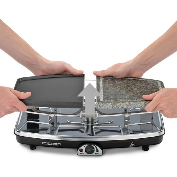 | Feature | Zwei abnehmbare Grillplatten: Natursteinplatte, Aluminium-Druckguss-Grillplatte (antihaftbeschichtet) | ||