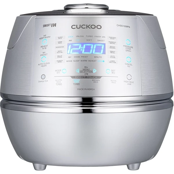Der CRP-CHSS1009FN Dampfdruck Reiskocher von Cuckoo überzeugt mit seinen unzähligen Funktionen und Einstellungen. Er bietet eine Vielzahl von Möglichkeiten für das absolut perfekte Kochresultat. Die doppelte Dichtungsbeschichtung aus Gummi versiegelt den Topf komplett und verhindert das ungewollte Entweichen des Dampfes, was auch dem Geschmack sehr zuträglich ist. Der abnehmbare Hygienedeckel aus Edelstahl ist spülmaschinenfest und daher sehr einfach zu reinigen. Die Cuckoo Induktionserhitzung erzeugt eine gleichmäßige Temperatur von allen Seiten. Das Dampfkochen erhält nicht nur die Nährstoffe und den Geschmack des Essens, sondern verkürzt auch die Kochzeit immens. Mit dem CRP-CHSS1009FN lassen sich auch die Vorteile von braunem, gekeimtem Reis (Gaba Reis) mit nur einem Knopfdruck genießen. Dank der intelligenten DSP-Technologie von Cuckoo wird die Quellzeit reduziert, wodurch der Reis mehr Nährstoffe behält und einen hervorragenden Geschmack entwickelt. Der Cuckoo CRP-CHSS1009FN mit der dem IH (Induktion Heating) programmierbaren Dampfdruckprogramm und der S-Line-Path-Technologie (patentiertes Sicherheitsdampfventil) ist der perfekte Begleiter in jeder Küche. Mit dem CRP-CHSS1009FN kann aber nicht nur Reis zubereitet werden, man kann auch Joghurt zubereiten oder den eigenen Käse ansetzen. Die vorprogrammierten Funktionen bieten eine kaum vergleichbare Kochvielseitigkeit, ob Sushi-Reis, Suppen aller Art, Haferbrei oder Brot backen. Mit dem CRP-CHSS1009FN ist das kein Problem. Beste Materialien kombiniert mit neuster Technologie zeichnen den Reiskocher von Cuckoo aus und machen sie unverwechselbar!