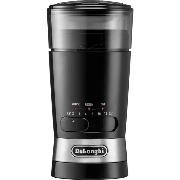 Die DeLonghi KG210 ist eine elektrische Kaffeemühle mit Klingenmahlwerk, die mühelos Bohnen zu Pulver zerkleinert. Dank der Edelstahlklingen ist der Mahlmechanismus sehr langlebig und robust. Der transparente Bohnenbehälter fasst bis zu 90 Gramm und man mahlt einfach nur so viel Kaffee wie benötigt wird. Der Mahlvorgang wird über Druck auf den Deckel gestartet. Wird die Taste gedrückt leuchtet ein Lämpchen für fein, mittel oder grob auf. So können die Bohnen ganz einfach nach den individuellen Bedürfnissen gemahlen werden. Der Behälter der KG210 Kaffeemühle ist leicht entnehmbar und kann nach Benutzung mit der beiliegenden Bürste gereinigt werden. Art.-Nr.: 1628075