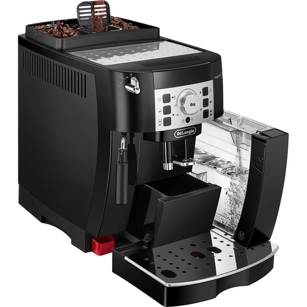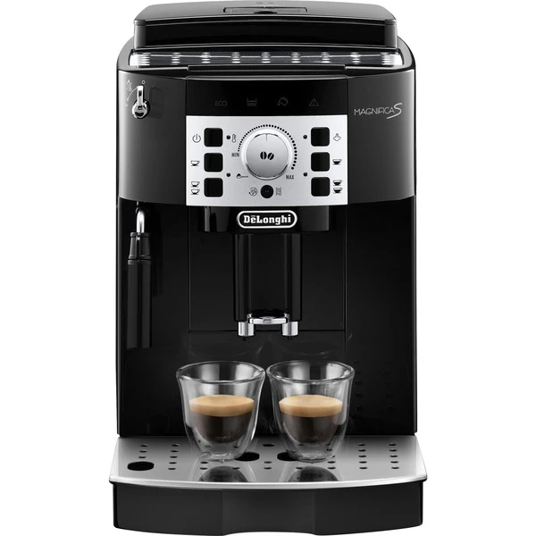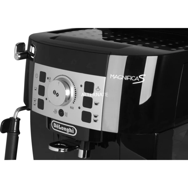 Die Magnifica S ECAM 22.110.B von DeLonghi ist ein Kaffeevollautomat der Extraklasse. Nach dem Einschalten benötigt die Maschine ca. eine Minute zum Erhitzen, anschließend kann man sich auch gleich schon den ersten Kaffee zubereiten. Der Automat ist sehr leicht zu bedienen, der Wassertank kann ganz einfach nach vorne entnommen und befüllt werden. Der Bohnenbehälter mit Aromaschutzdeckel befindet sich oben, genauso wie auch der Kaffeepulverschacht. Der Mahlgrad sowie die Kaffeemenge und -stärke können einfach eingestellt werden. Die integrierte Milchaufschäumdüse ermöglicht zudem die Zubereitung von traditionellem Milchschaum oder heißer Milch für zusätzlichen Kaffeegenuss. Sobald eine Entkalkung nötig ist, wird es angezeigt und man kann mit wenigen Handgriffen ein Entkalkungsprogramm abspielen lassen, das nach ca. einer halben Stunde abgeschlossen ist.Art.-Nr.: 789286
