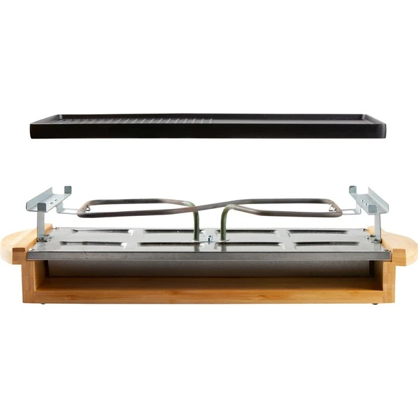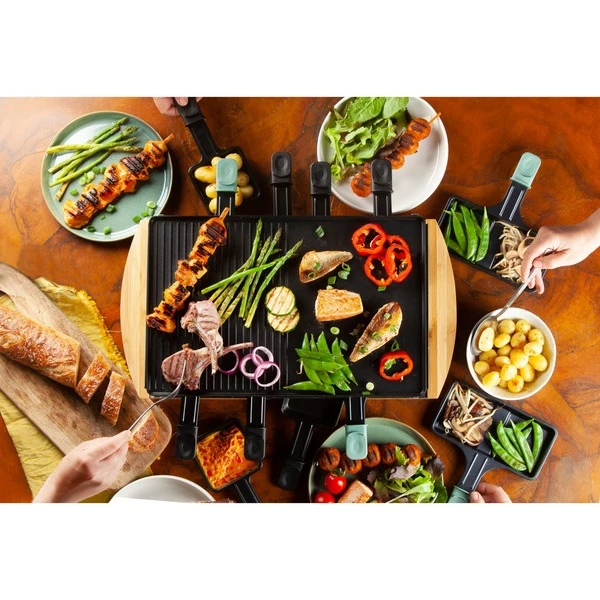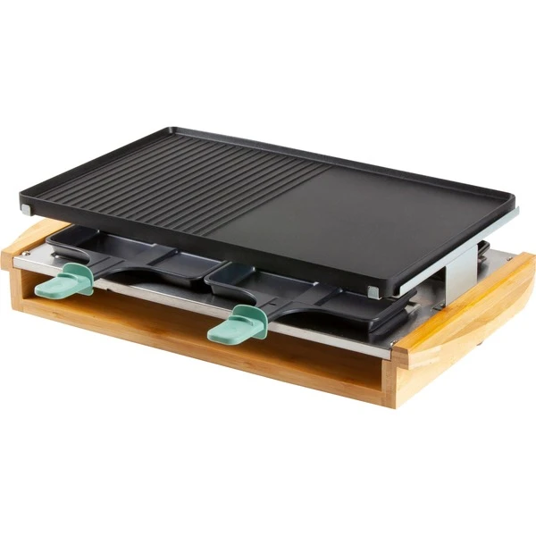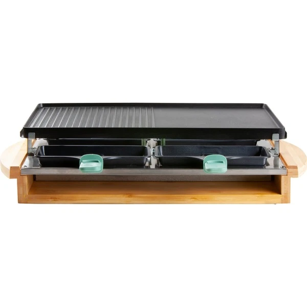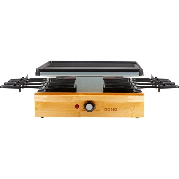 Das Domo Raclette Bamboo D09246G im bietet Genuss für acht Personen. Für ein ideales Ergebnis verfügt das D09246G über eine hochwertige Bratfläche mit Antihaftbeschichtung die auf einer Hälfte eine gerillte und auf der anderen eine glatte Oberfläche hat. Die Bedienung ist dank stufenloser Temperaturregelung sehr einfach und durch die Leistung von 1200 Watt ist das Gerät schnell einsatzbereit. Das Bamboo Raclette bietet auch eine Parkzone für die Raclettepfännchen. Im Lieferumfang sind 4x antihaftbeschichtete XL Pfännchen und 8x antihaftbeschichtete Einzelpfännchen enthalten. Für eine einfache Reinigung sind auch die Pfännchen mit einer Antihaftbeschichtung versehen.