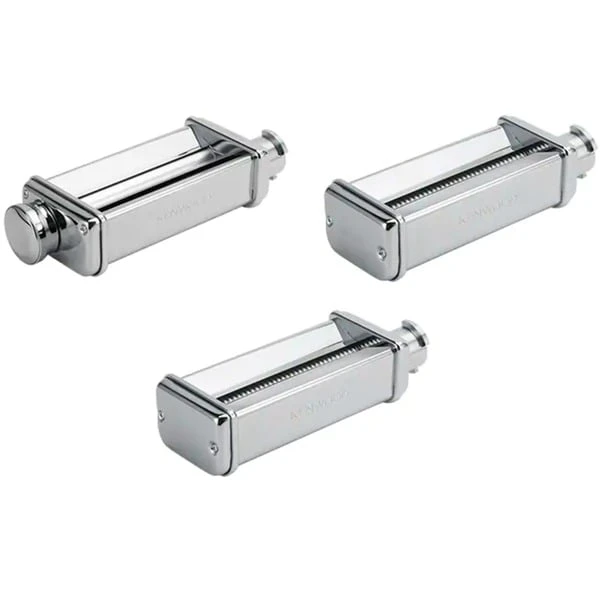 Das Kenwood Pasta-Set, passend für die Kenwood Chef Serie und kMix Küchenmaschinen, macht Pastaträume wahr. Das Gehäuse aus strapazierfähigem verchromtem Edelstahl ist besonders langlebig und für große Mengen geeignet. Für besonders gute Ergebnisse sorgen dabei die hochwertigen Walzenrollen aus eloxiertem Aluminium. Das Set besteht aus einer Lasagne-Walze sowie Schneideinsätzen für Fettuccine und Spaghetti. Durch den verstellbaren Knopf der Lasagne-Walze lassen sich Nudelplatten in 10 verschiedenen Stärken herstellen, das ist ideal für Lasagne, Ravioli oder Cannelloni. Für perfekte Spaghetti mit einer Nudelbreite von 2,0 mm sorgt der Spaghetti-Schneideinsatz.