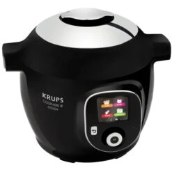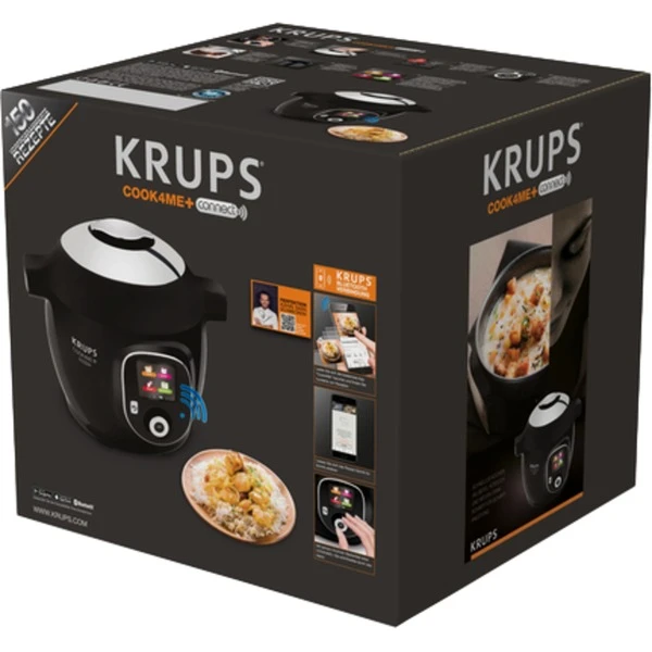 Mit dem vernetzten Cook4Me Touch Multikocher mit Schnellkochfunktion von Krups entdeckt man eine neue Ära des Kochens. Er ermöglicht eine mühelose, schnelle und gelingsichere Zubereitung von unendlich vielen frischen und gesunden Rezepten über den Touchscreen, der Fotos und Videos bereitstellt und Schritt für Schritt durch den gesamten Kochvorgang leitet. Man braucht nicht mehr grübeln, was man kochen soll. Der elektrische Cook4Me Schnellkochtopf bietet eine schier unendliche Anzahl direkt integrierter Rezepte. Dank der zahlreichen Filter lässt sich schnell ein passendes Rezept auswählen: Vorspeise, Hauptgericht, Dessert, Zubereitung in 10, 20 oder 30 Minuten? Sogar eine gezielte Rezeptsuche ist möglich, je nachdem welche Zutaten gerade vorhanden sind. Noch nie wie war ein Cook4Me so schnell und die Zubereitung von frischen, selbst gekochten Gerichten so einfach. Mit ihm hat man die Möglichkeit, Hunderte von Rezepten in weniger als 10 Minuten frisch zuzubereiten. Außerdem passt er den Garvorgang an das gewählte Rezept an, hält die Speisen automatisch warm, lässt sich im Voraus programmieren und ist dank spülmaschinenfestem Behälter und Dampfgareinsatz besonders pflegeleicht. Für eine unbegrenzte Vielzahl von Rezepten verfügt der Cook4Me über 13 Gareinstellungen: von der Schnellkochfunktion Garen unter Druck über Anbraten und Schmoren bis hin zu schonendem Dampfgaren. Dank der Cook4Me-App hat man jederzeit Zugriff auf den Multikocher. Der Garprozess lässt sich aus der Ferne verfolgen, eigene Rezepte können erstellt werden, die automatisch mit dem Cook4Me synchronisiert werden. Um zu Hause direkt mit dem Kochen beginne zu können, kann man von überall Rezepte an den Multikocher senden, dazu lassen sich die Rezepte mit der Community teilen.Art.-Nr.: 1759711