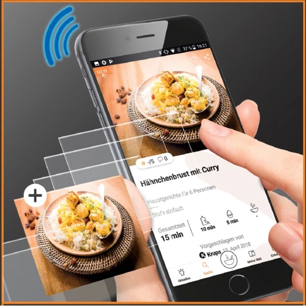 | Weitere Informationen | Dank WLAN-Verbindung werden alle Aktualisierungen und neuen Rezepte von Krups automatisch auf den Cook4Me Touch heruntergeladen. Mit dem Cook4Me greift man direkt auf eine schier unendliche Fülle von Rezepten zu. Eigene Rezeptbücher können über die App erstellt werden, die sofort auf dem Cook4Me angezeigt werden. Über die Cook4Me-App lässt sich der Garvorgang jederzeit aus der Ferne überwachen. Verschiedene Signale zeigen an, wann der Kochvorgang beendet ist. | ||