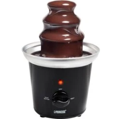 Der Princess 292994 Schokoladenbrunnen ist das ideale Gerät für alle Naschkatzen. Der Brunnen schmilzt die Schokolade und pumpt sie nach oben, wo sie dann über drei Ebenen wieder nach unten fließt. Dann kann man verschiedene Lebensmittel wie Fruchtstücke, Kekse und Marshmallows in den süßen Schokoladenstrom zu tauchen. Der Princess Schokoladenbrunnen ist ganz einfach zu benutzen. Einfach fein geraspelte Schokolade in die Tropfschale geben und den Drehschalter in die erste Stellung bringen. Sobald die Schokolade geschmolzen ist, kann der Drehschalter in die zweite Stellung eingestellt werden. Daraufhin strömt die Schokolade oben heraus und man kann genießen. Das Heizelement hält die Temperatur der Schokolade konstant, so dass sie flüssig bleibt und nicht anbrennt. Für eine perfekte Schokoladenkaskade muss eventuell etwas Kakaobutter oder einen Teelöffel Öl zur Schokolade hinzugefügt werden. Nach Gebrauch kann die restliche Schokolade aus dem Brunnen zum abkühlen einfach in ein kleineres Behältnis gegossen werden. Das Oberteil des Brunnens ist abnehmbar und lässt sich einfach abspülen. Die Edelstahl-Auffangschale lässt sich mit einem Spülmittel problemlos reinigen. Art.-Nr.: 1466792