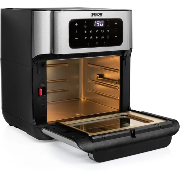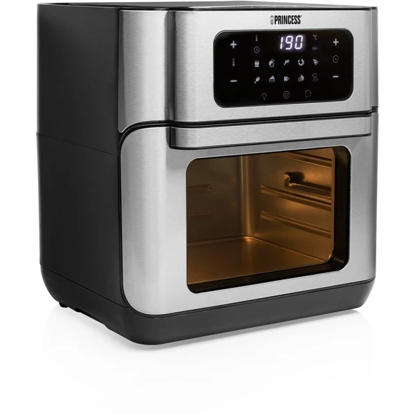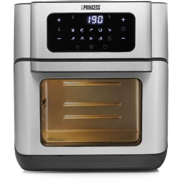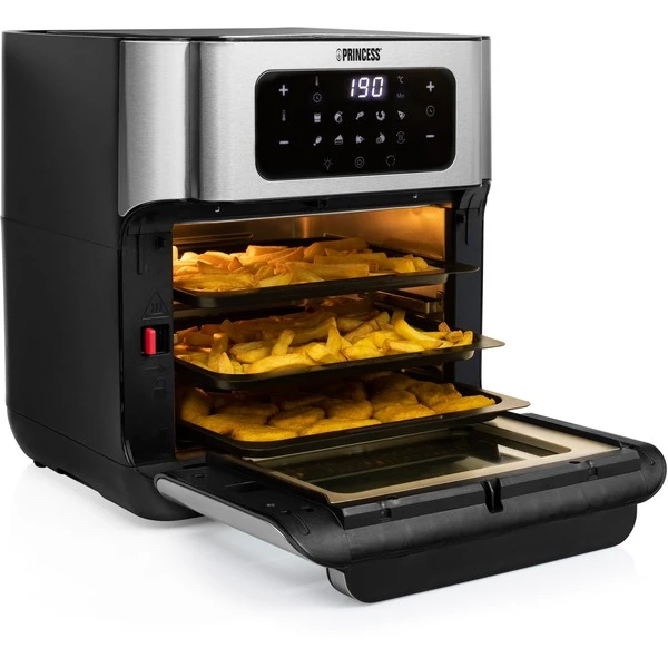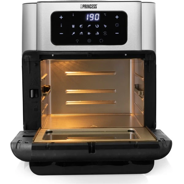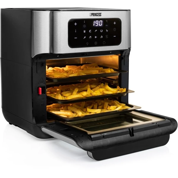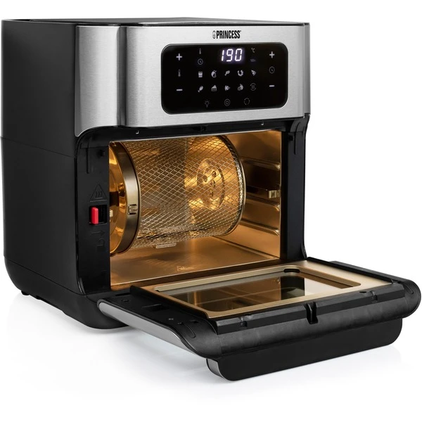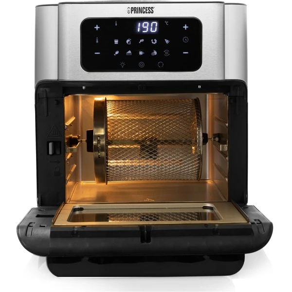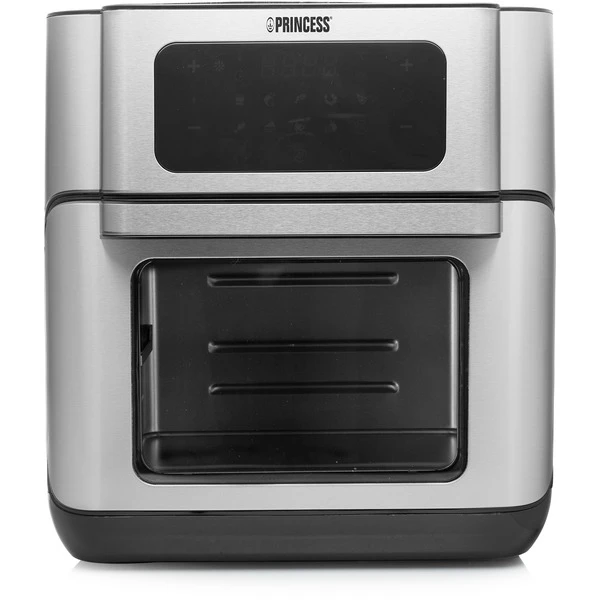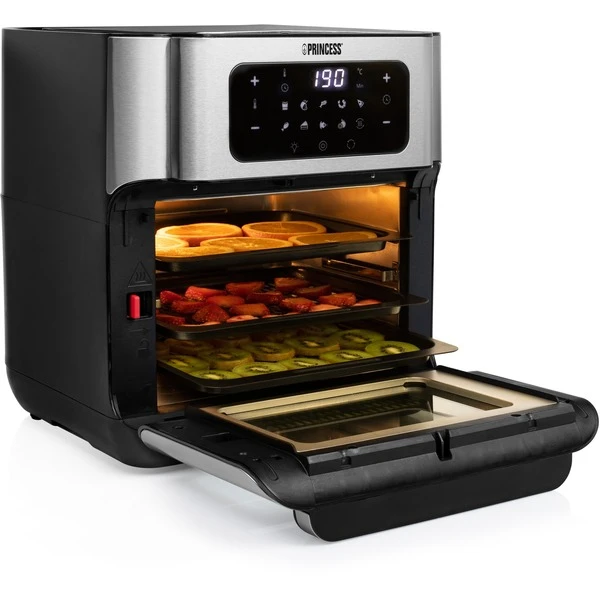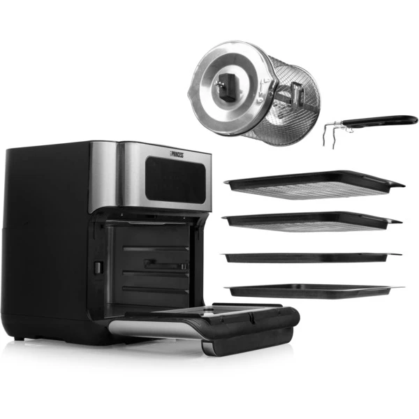 Die luxuriöse Kombination des Princess Aerofryer Ofen aus Heißluftfritteuse und Miniofen kann grillen, backen, frittieren, braten und sogar dörren. Der rotierende Drahtkorb sorgt für krosse Pommes Frites, ohne alle 5 Minuten rütteln zu müssen. Außerdem kann das Gerät mit einer speziellen Luftkonvektionstechnologie auf 3 Backflächen eine Menge Snacks zubereiten. Abgesehen von den zehn programmierten Einstellungen kann die Temperatur auch manuell zwischen 40 °C und 200 °C reguliert werden, um ein perfektes Ergebnis zu erzielen. So lassen sich Brötchen, Fleischbälle und Quiche ganz einfach zubereiten. Dank der zugehörigen drei Grillroste passen viele Produkte gleichzeitig in den Ofen. Darüber hinaus sorgen die 90-Minuten-Timerfunktion und der Überhitzungsschutz dafür, dass der Aerofryer Ofen sicher im Gebrauch ist. Mit dem speziell dafür entwickelten Griff kann man den Drehkorb leicht entnehmen und über einem Teller entleeren, ohne eine heiße Oberfläche berühren zu müssen. Dank der zirkulierenden Heißluft im Princess Aerofryer Ofen ist der Einsatz von Öl keine Notwendigkeit mehr, um Pommes Frites, Fleisch, Fisch und Gemüse zuzubereiten. So lässt sich gesünder kochen und trotzdem all die Lebensmittel genießen, die so beliebt sind. Selbst Snacks, Gebäck oder Brot wird knusprig und lecker. Außerdem hat der Aerofryer Ofen eine Dörrfunktion für Früchte und Gemüse. Die beste Art, gesunde Snacks wie Trockenobst oder Gemüsechips für sich oder die Kleinen zuzubereiten.Art.-Nr.: 1672883