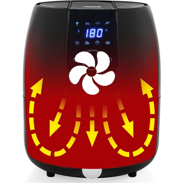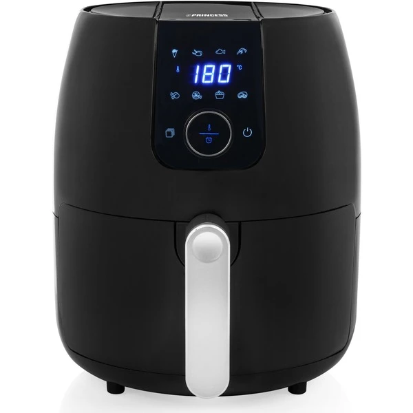 Mit dem Princess Aerofryer XXL 182025 lassen sich gesunde Speisen für die ganze Familie frittieren, braten, backen, grillen, kochen und rösten. Dank 4,5 l Fassungsvermögen können bis zu sechs Portionen knusprige und köstliche Pommes Frites in einem Durchgang zubereitet werden. Dank Digitaldisplay und 8 vorprogrammierten Einstellungen ist die Zubereitung von Speisen im Aerofryer das reinste Kinderspiel. Wenn man die perfekte Temperatur und Garzeit nicht kennt, bietet der Princess Aerofryer sieben vorprogrammierte Einstellungen, die mit einem Touch für Pommes Frites, Fleisch, Fisch, Krabben, Hähnchen, Steak und Kuchen ausgewählt werden können. Wenn man lieber die eigenen Temperaturen und Garzeiten verwenden möchte, kann man diese am bedienungsfreundlichen Digitaldisplay mit integriertem Timer bequem einstellen. Durch die einzigartige Kombination aus warmer zirkulierender Luft und der bequem einstellbaren Temperatur ist die Zubereitung mit dem Princess Digital Aerofryer XXL gesund und fettarm. So erzielet man auch ohne Öl stets ein äußerst knuspriges Ergebnis. Mit dem abnehmbaren Korb und dem stets kühlen Griff ist das Servieren der Zutaten einfach und sicher. Der abnehmbare Korb und die antihaftbeschichtete Schublade des Princess Digital Aerofryer XXL sind spülmaschinenfest, so dass der Aerofryer im Handumdrehen gereinigt ist. Dank Anti-Rutsch-Füßen hat der Aerofryer auf fast jeder Fläche einen sicheren Stand und kann weder kippen noch verrutschen. Eine weitere Sicherheitseinrichtung ist der Überhitzungsschutz, der dafür sorgt, dass der Aerofryer nicht zu heiß wird. Für schmackhafte und gesunde Gerichte wird die Princess-Heißluftfritteuse rasch zu ihrem neuen Lieblingsküchengerät.Art.-Nr.: 1521788