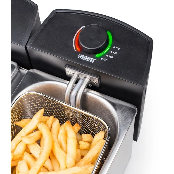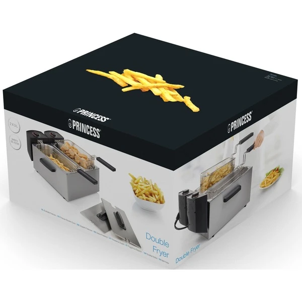 Mit der leistungsstarken Princess 183123 Doppel-Fritteuse kann man die zweifache Menge an Fisch und Pommes Frites für die Familie gleichzeitig garen. Dank einer Leistung von 2 x 1800 Watt wird die Fritteuse sehr schnell heiß. Ab sofort braucht man sich dank der Kaltzone und des innovativen Schutzfilters, der das Verspritzen von Fett und ein Übergaren verhindert, keine Sorgen mehr über verbrannte Stücke zu machen. Die Filter können auch benutzt werden, um das Fett zu filtern und viel länger sauber zu halten. Beide Frittierbehälter haben zwar einen gemeinsamen Stecker, können aber getrennt benutzt werden. Viele Fritteusen haben das Problem, dass kleine Krümel durch den Korb fallen und verbrennen, wenn das Fett mehr als einmal verwendet wird. Die Princess Doppel-Fritteuse verfügt über eine besondere Kaltzone, die das verhindert. Kleine Partikel werden in der Kaltzone unterhalb des Heizelements aufgefangen und verbrennen daher nicht. Mit dem Fettschutzfilter können all diese Partikel herausgefiltert werden. Das Fett bleibt dadurch erheblich länger sauber und es bilden sich keine schwarzen, ungesunde Rückstände auf den Pommes Frites. Der innovative Schutzfilter der Princess Fritteuse verteilt die Wassertropfen, die beim Frittieren von Tiefgefrorenem entstehen, so dass es weniger Spritzer gibt. Das Frittieren wird dadurch sicherer, und die Arbeitsplatte bleibt von Fettspritzern verschont. Die Princess Fritteuse hat einen Hauptstecker, so dass man für den Betrieb nur eine Steckdose braucht. Die beiden Heizelemente sind miteinander verbunden und lassen sich leicht abnehmen. Außerdem hat die Fritteuse zwei separate Thermostate, so dass jeder Behälter einzeln geregelt werden kann und Pommes Frites, Fisch oder Snacks gleichzeitig bei jeweils idealer Temperatur zubereitet werden können. Die Fettbehälter der Princess Fritteuse können einfach herausgenommen werden, zum Beispiel zum Austauschen des Fetts oder zum Reinigen der Behälter. Alle Teile der Fritteuse sind abnehmbar und überwiegend spülmaschinenfest. Die Griffe am Frittierkorb können außerdem eingeklappt werden. Auf diese Weise lässt sich das Gerät leicht reinigen und verstauen.Art.-Nr.: 1466802