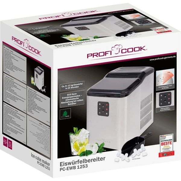 Die ProfiCook Eiswürfelmaschine PC-EWB 1253 verwöhnt die Gäste mit schnell und einfach hergestellten Eiswürfeln. Sie stellt Würfel in zwei verschiedenen Größen für eisgekühlte Getränke innerhalb von wenigen Minuten bereit, egal ob beim Camping, im Büro, in der Küche oder in der Hausbar. Dazu ist keine mühsame Installation erforderlich, denn der integrierte Wassertank der Eiswürfelmaschine mit 1,5 Litern Kapazität braucht nur aufgefüllt werden. Der Eiswürfelbereiter PC-EWB 1253 überzeugt außerdem mit hygienischer Sauberkeit dank des Reinigungsprogramms, und er schont gleichzeitig die Umwelt mit dem ECO Save-Energiesparmodus.Art.-Nr.: 1910842
