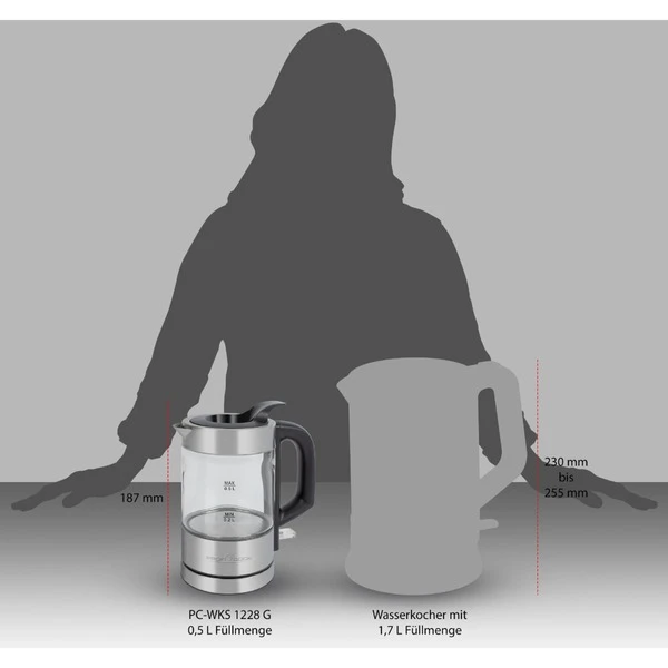 Der kleine Wasserkocher PC WKS 1228 G mit 0,5 Liter Füllmenge besticht durch eine zeitlose Optik aus Glas und Edelstahl und verfügt über eine praktische Einhandbedienung für einfaches Wasser nachfüllen mit nur einer Hand. Beim Wasserkochen wird der Wassertank zusätzlich mit einer blauen LED beleuchtet. Durch den simplen Befüll-Mechanismus ermöglicht der Wasserkocher eine komfortable Ein-Hand-Bedienung, ohne den Deckel anheben oder eindrücken zu müssen. Das Wasser kann ganz einfach oben eingefüllt werden. Zusätzlich filtert der Kalkfilter effektiv Kalk und Schwebestoffe aus dem Wasser. Dank der kompakten Größe ist der Wasserkocher nicht nur im Haushalt ein echtes Multitalent sondern eignet sich auch perfekt als Reise-Wasserkocher für unterwegs, z.B. beim Camping. Das leistungsstarke Heizelement kocht das Wasser besonders schnell und ohne lange Wartezeiten in nur nur 3,5 min. auf. So eignet er sich ideal für die Zubereitung von Tee, aber auch Babynahrung und Filterkaffee lassen sich mit dem Glas-Wasserkocher leicht zubereiten.Art.-Nr.: 1862960