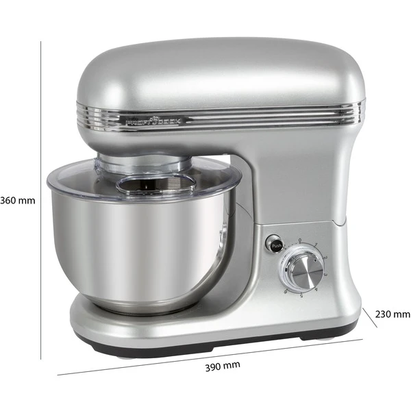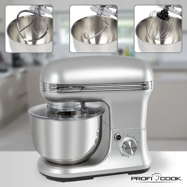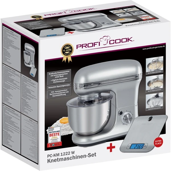 Leistungsstark für die ganze Familie: Mit der kraftvollen Knetmaschine von ProfiCook inklusive großer 5 Liter Edelstahlschüssel für ca. 2,5 – 3 kg bereitet man in Nullkommanichts perfekten Teig oder andere Lebensmittel zu. Dank 6 Geschwindigkeitsstufen und Pulsfunktion, konstanter Leistung durch lastabhängiger elektronischer Drehzahlregelung, robustem Spezialgetriebe und Longlife-Profi-Motor fertigt die leistungsstarke Knetmaschine optimale Ergebnisse. Die ProfiCook-Knetmaschine hat einen transparenten Spritzschutzdeckel mit Nachfüllöffnung, so lassen sich während des Betriebes weitere Zutaten hinzufügen. Der Deckel ist zur leichten Reinigung in der Spülmaschine abnehmbar. Saugfüße sorgen für einen sicheren Stand des Gerätes. Zusätzlich überzeugt die PC-KM 1222 mit einem massiven Alu-Druckguss-Gehäusedeckel (lackiert, für hohe Stabilität), einem Softanlauf (für langsames Rühren), einem schwenkbaren Multifunktionsarm mit Entriegelungsmechanismus und einer Sicherheitsschaltung (stoppt beim Hochklappen des Armes). Im Lieferumfang ist eine digitale, extra flache Edelstahl-Küchenwaage enthalten. Die hochwertige Küchenwaage von ProfiCook mit einer Tragkraft von 5 kg liefert präzise Gewichtsangaben und ist dank dem slim-line Design kompakt und leicht aufzubewahren. Mit der Tara-Zuwiegefunktion können beliebig viele Zutaten separat in 1-g Schritten zu gewogen werden. Durch die automatische Abschalt-Funktion erhöht sich die Batterielebensdauer. Zudem besteht die Wiegefläche komplett aus hochwertigem Edelstahl, sodass sich das Gerät schnell reinigen lässt.Art.-Nr.: 1805382