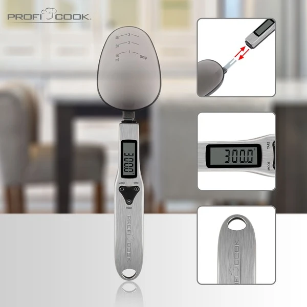 Die digitale Löffelwaage eignet sich ideal zum präzisen Abmessen kleinerer Mengen von beispielsweise Gewürzen oder Kräutern, Tee, Mehl, Zucker, Nahrungsergänzungsmitteln und vielem mehr. Die Zutaten können direkt aus der Packung portioniert werden, es ist kein Umfüllen notwendig. Der Messbereich reicht bis 300 g und bei Flüssigkeiten bis zu 45 ml. Die Maßeinheit kann zwischen g und oz umgestellt werden. Dazu verfügt die Löffelwaage über eine Tara- und eine Hold-Funktion diese ermöglicht das komfortable Einfrieren des Messergebnisses. Der Wiegelöffel ist BPA-frei und ist mit einer Skala ausgestattet. Zur leichten Reinigung kann der Wiegelöffel einfach abgenommen werden. Der Griff mit Edelstahlgehäuse verfügt über ein LCD-Display und eine praktische Aufhängöse. Die automatische Abschaltung erhöht die Batterielebensdauer.
