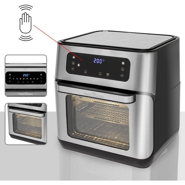 Die PC-FR 1200 H von ProfiCook mit eleganter Edelstahlfront und -deckel, ist eine vielseitige Heißluftfritteuse für eine fettarme Ernährung. Mit ihr lassen sich, im Vergleich mit herkömmlichen Fritteusen, verschiedenste Gerichte mit bis zu 80 % weniger Fett zubereiten. Die Luftzirkulation ermöglicht es die Speisen zu frittieren, grillen, rösten und backen und das mit geringer Rauch- und Geruchsentwicklung. Die Bedienung erfolgt über das digitale Bedienfeld mit LED-Display. Es gibt neun Automatikprogramme mit variabler Zeit- und stufenloser Temperatureinstellung bis max 200°C. Für weiteren Bedienkomfort sorgt ein Timer mit Endsignal. Mit einer Kapazität von 11 L und dem umfangreichen Zubehör können mit der PC-FR 1200 H die verschiedensten Gerichte zeit- und energiesparend zubereitet werden. Dank des rotierenden Frittierkorbes werden die Speisen gleichmäßig gegart. Auf dem Drehspieß können beispielsweise Hähnchen knusprig gegrillt werden oder es lassen sich sechs rotierende Spieße mit Grillgut bestücken. Die zwei Einschubgitter ermöglichen das zeitgleiche Zubereiten unterschiedlicher Speisen. Vier Einschubhöhen sorgen für optimale Backergebisse. Durch das große Sichtfenster mit zuschaltbarer Innenraumbeleuchtung hat man das Gargut immer im Blick. Das Entnahmewerkzeug und der Cool Touch-Griff sorgen für die nötige Sicherheit.Art.-Nr.: 1651382