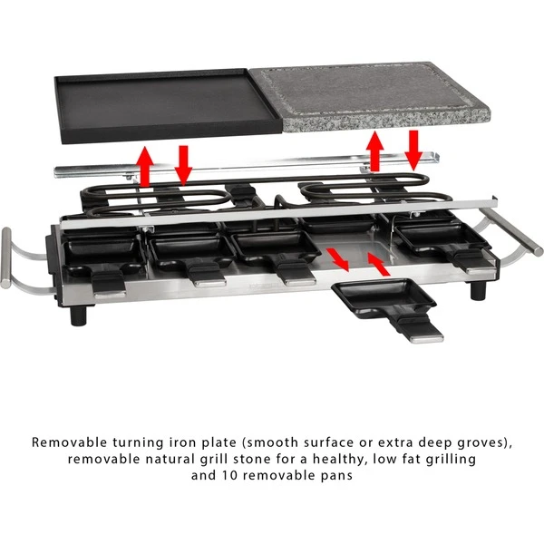 Grillen und genießen, deftig oder gesund – mit dem eleganten und hochwertig verarbeiteten Raclette-Grill von ProfiCook. Das leistungsstarke (1700 Watt) Raclette besteht aus einem Naturgrillstein für gesundes und fettarmes Grillen von Gemüse und einer Wendegussplatte mit kombinierter Grillfläche zum Grillen von Fisch oder Fleisch. Mit einer extra großen Grillfläche von ca. 48,5 x 24 cm (2x ca. 24 x 24 cm) findet jede Zutat Ihren richtigen Platz. Bis zu 10 Personen haben die Möglichkeit die antihaftbeschichteten Pfännchen inklusive wärmeisoliertem Griff mit Zutaten Ihrer Wahl zu befüllen. Die kombinierte Grillfläche der Wendegussplatte bietet zum Grillen von Fisch eine glatte Oberfläche oder extra tiefe Rillen für ein intensives Grillmuster für Fleisch. Mit dem Naturgrillstein lässt sich gesund und fettarm Grillen. Er speichert die Wärme, wodurch das Grillgut schonend gegart und dadurch zart und saftig wird. Mit Hilfe des stufenlos regelbaren Thermostat lässt sich die Temperatur individuell und ganz nach den persönlichen Bedürfnissen regulieren. Zusätzlich zeigt die Kontrollleuchte (rot beleuchtet) an, wenn das Gerät eingeschaltet ist. Für eine einfache Reinigung ist das Gerät leicht zerlegbar. Im Lieferumfang sind 10 Pfännchen und 10 Holzspachtel enthalten. Die Pfännchen können dank Antihaftbeschichtung (schneid- und kratzfest) leicht und schnell gereinigt werden.