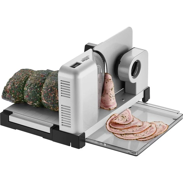 Der elektrische Allesschneider icaro5 für klappbares Schneid-Vergnügen. Die Metallausführung verleiht dem Gerät nicht nur ein edles Aussehen im eleganten ritter-Silbermetallic und macht sie damit zu einem echten Eye-Catcher in jeder Küche – sie ist so auch wunderbar einfach zu handeln und nach Gebrauch zu reinigen. Wird die icaro5 nach getaner Schneidarbeit wieder zusammengeklappt, ist die Maschine nur noch 10 cm breit und findet dadurch selbst in kleineren Küchen wunderbar Platz. Auseinandergeklappt benötigt sie ebenfalls nur wenig Raum auf der Arbeitsfläche; und das, obwohl ca. 20 cm Schlittenweg zur Verfügung stehen. Möchte man größeres Schneidgut wie beispielsweise einen großen Laib Brot oder ein üppiges Stück Schinkenspeck aufschneiden, lässt sich der Schneidgutschlitten leicht entriegeln und sogar komplett entfernen. Die Schnittstärke kann je nach Belieben von hauchdünn bis ca. 14 mm stufenlos eingestellt werden, ganz einfach mithilfe des Einstellrads. Für den perfekten „Schnitt“ sorgt das im Lieferumfang enthaltene Wellenschliffmesser aus rostfreiem Edelstahl. Für extra hohen Bedienkomfort sowie maximale Sicherheit während des Schneidvorgangs wird durch den Moment- und Dauerschalter gesorgt.Art.-Nr.: 1834790
