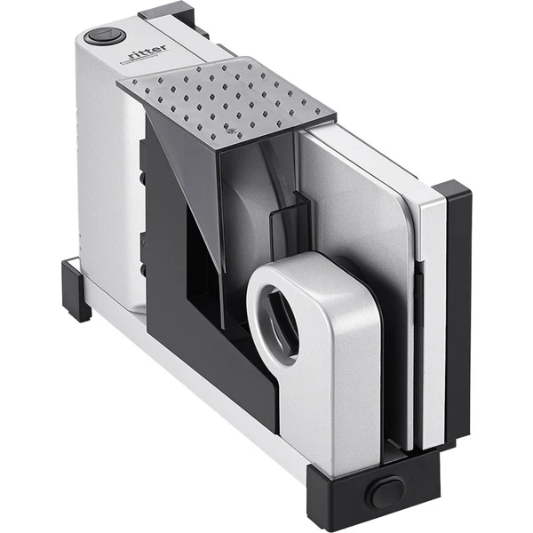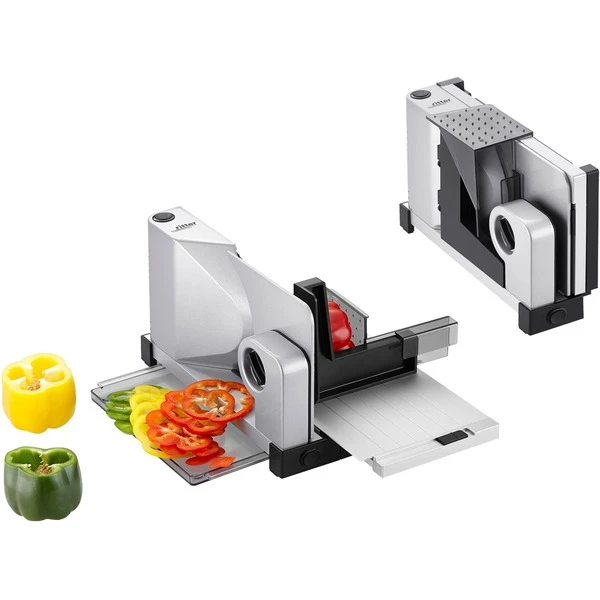 Beim ersten klappbaren Vollmetall-Allesschneider icaro 7 steht ganz klar die Funktion im Vordergrund, denn das Gerät kann nach Gebrauch platzsparend zusammengeklappt werden. Geklappt ist der Allesschneider nur noch 10 cm breit und kann praktisch und platzsparend im Schrank verstaut werden. icaro 7 ist somit der perfekte Allesschneider, wenn nicht viel Platz in der Küche vorhanden ist. Auch im Gebrauch nimmt das praktische Gerät wenig Platz auf der Arbeitsplatte in Anspruch. Die Vollmetallausführung des Allesschneiders bietet besondere Stabilität sowie optimale Schneidergebnisse, was nicht zuletzt auch die Lebensdauer des Gerätes verlängert. Ob hauchdünn oder bis ca. 14 mm dick – alles wird gleichmäßig in appetitliche Scheiben geschnitten – egal, ob Brot, Wurst, Käse oder auch Gemüse. Für den perfekten „Schnitt“ sorgt das Wellenschliffmesser aus rostfreiem Edelstahl. Weitere praktische Details unterstreichen die Benutzerfreundlichkeit des klappbaren Allesschneiders: So kann das Messer zur Reinigung durch einen bequemen Bajonett-Schnellverschluss ohne zusätzliches Werkzeug unkompliziert abgenommen werden. Ebenso lässt sich der Schneidgutschlitten zur einfachen Reinigung leicht entriegeln und abnehmen. Auch übergroßes Schneidgut ist durch die breite Auflegefläche aus Metall kein Problem für den Allesschneider icaro 7. Das 2-Finger-Einschaltsystem des Allesschneiders icaro 7 schafft zusätzliche Sicherheit beim Schneiden. Je nach Belieben kann der Vollmetall-Allesschneider im Moment- oder Dauerbetrieb eingesetzt werden. Angetrieben wird die icaro 7 durch einen kraftvollen 65 Watt Eco-Motor. Zeitloses Design in reduzierter und klare Bauhaus-Optik. Hochwertige Materialien und eine perfekte Verarbeitung sorgen bei dem icaro 7 für eine hohe Lebensdauer – ein ideales Gerät für alle, die Wert auf ein praktisches und hochwertiges Gerät legen.Art.-Nr.: 1211228