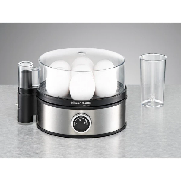 Der Rommelsbacher Eierkocher ER 400 ist die attraktive und clevere Lösung, um Eier für ein erstklassiges Schlemmer-Frühstück zuzubereiten. Das einfache Bedienkonzept und die ausgezeichneten Kochergebnisse überzeugen. In einem Kochvorgang können bis zu 7 Eier zubereitet werden, dabei kann deren Härtegrad von weich bis hart individuell eingestellt werden. Die Kochzeit wird elektronisch gesteuert. Nach Ablauf ertönt ein Signalton und die Eier können praktisch und sicher samt Eiereinsatz entnommen, abgeschreckt und serviert werden. Die pflegeleichte Heizschale aus Edelstahl und die praktische Kabelaufwicklung für nicht benötigtes Kabel sind weitere Pluspunkte dieses praktischen Küchenhelfers.Art.-Nr.: 1003024
