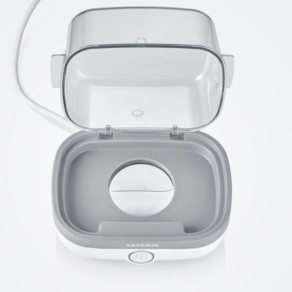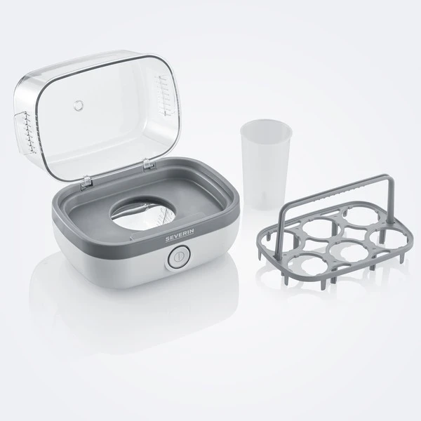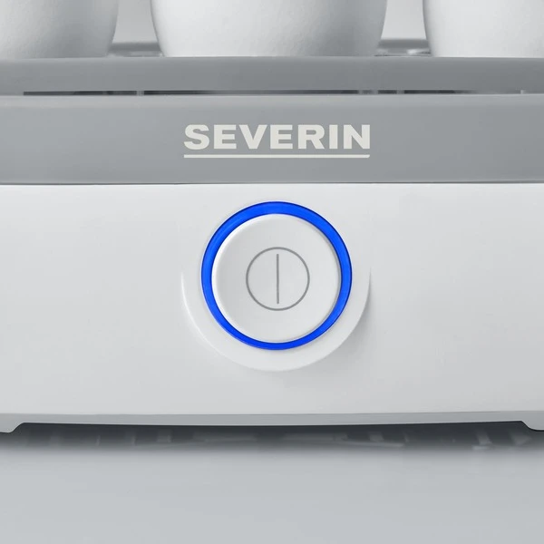 Der Severin Eierkocher EK 3164 bietet Platz für bis zu sechs Eier (S-XL). Mit einer Leistung von 420 Watt lassen sich Frühstückseier optimal kochen. Einfach mit dem beiliegenden Meßbecher kaltes Wasser abmessen, Eier in den Einsatz stellen und abdecken. Durch die klappbare und transparente Haube hat man den Kochvorgang immer im Blick. Die Bedienung erfolgt über einen Ein-/Ausschalter mit LED-Beleuchtung und nach beendeter Kochzeit ertönt ein Signalton. Durch das Perforieren der Eierschale mit dem integrierten Eierstecher an der Unterseite des Messbechers vermeidet man geplatzte Eier.Art.-Nr.: 1741042