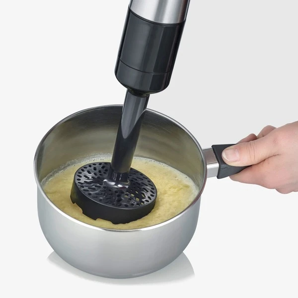 | Zubehör | vorhanden | Multizerkleinerer (0,5l Kapazität), Mixbehälter mit Deckel (0,7l Kapazität), Kartoffelstampfer, Schneebesen | |